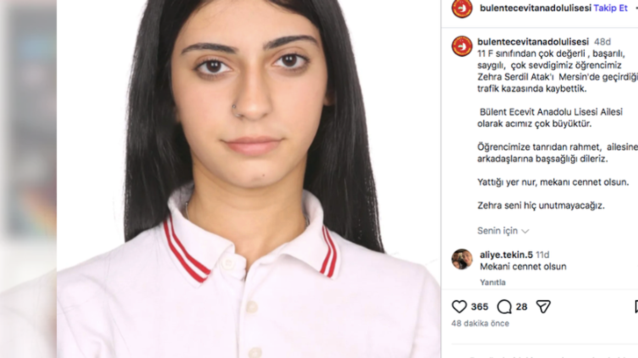 Bülent Ecevit Anadolu Lisesi, Mersin’de meydana gelen trafik kazasında yaşamını yitiren 48/D – 11/F sınıfı öğrencisi Zehra Serdil Atak için sosyal medya hesaplarından taziye mesajı paylaştı. Paylaşımda, Atak’ın başarılı, saygılı ve örnek kişiliğiyle okulda çok sevilen bir öğrenci olduğu vurgulandı.