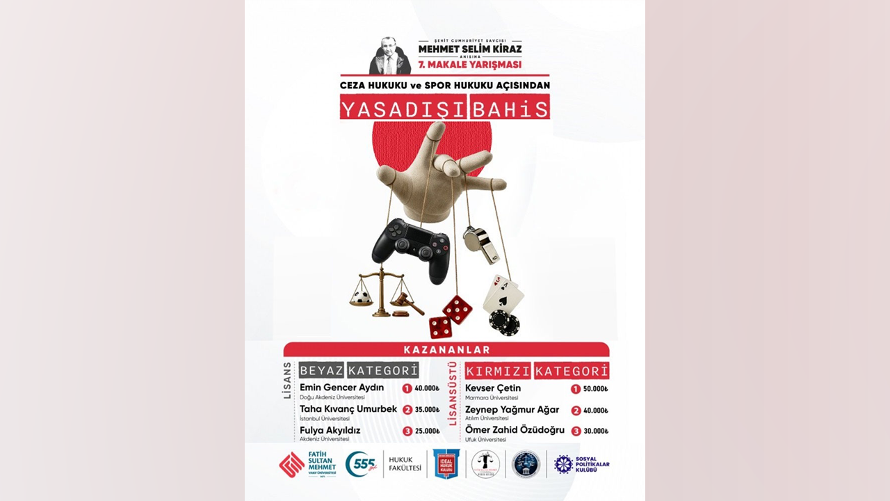 Bu yıl yedincisi düzenlenen ve Türkiye genelinden çok sayıda hukuk öğrencisinin katılımıyla “Yasa Dışı Bahis” temasıyla düzenlenen yarışmada, katılımcıların güncel bir toplumsal sorunu hukuki perspektiften ele alış biçimleri, analitik derinlikleri ve özgün katkıları çok yönlü olarak değerlendirildi.