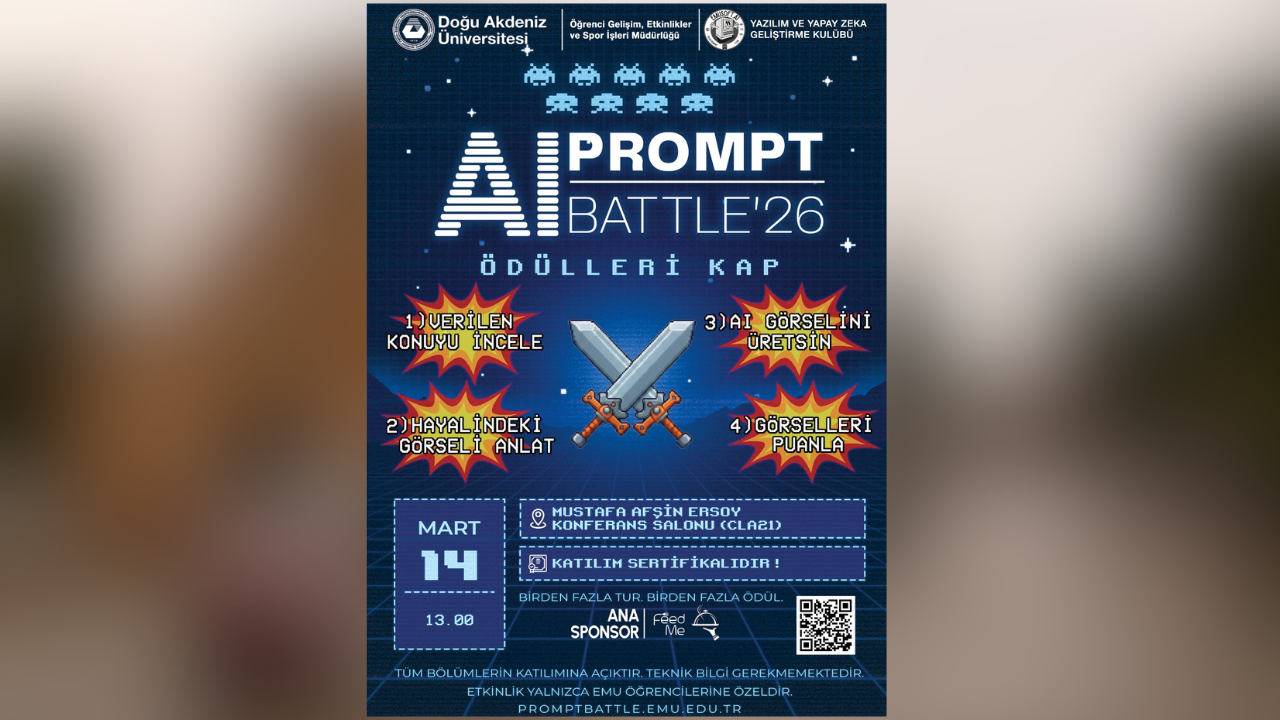 Feed Me Cyprus ana sponsorluğunda yapılacak etkinlikte katılımcılar, verilen konuya en yaratıcı yapay zekâ komutunu yazarak görseller üretecek. Ortaya çıkan çalışmalar anonim olarak oylanacak ve her tur sonunda başarılı katılımcılara ödüller verilecek.