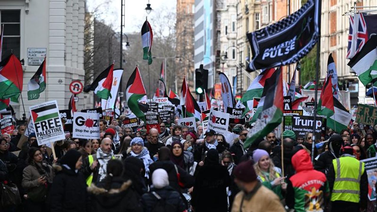 İsrail'in Filistin halkına karşı işlediği soykırım devam ettiği gerekçesiyle düzenlenen ulusal yürüyüşe katılan eylemciler, İngiliz hükümetinin İsrail'e silah satışlarına devam etmesine ve Gazze'de ateşkese rağmen İsrail saldırılarının sürmesine tepki gösterdi.