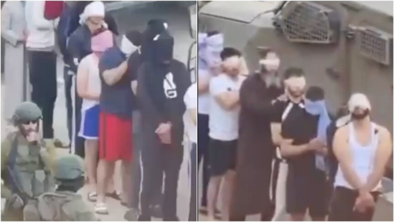 Er-Ram'da İsrail ordusunun evlerinden çıkardığı Filistinlileri, elleri ve gözleri bağlı şekilde tek sıra halinde bekleterek alıkoyduğu ve gözaltına aldığı anlara ilişkin görüntüler sosyal medyaya yansıdı.