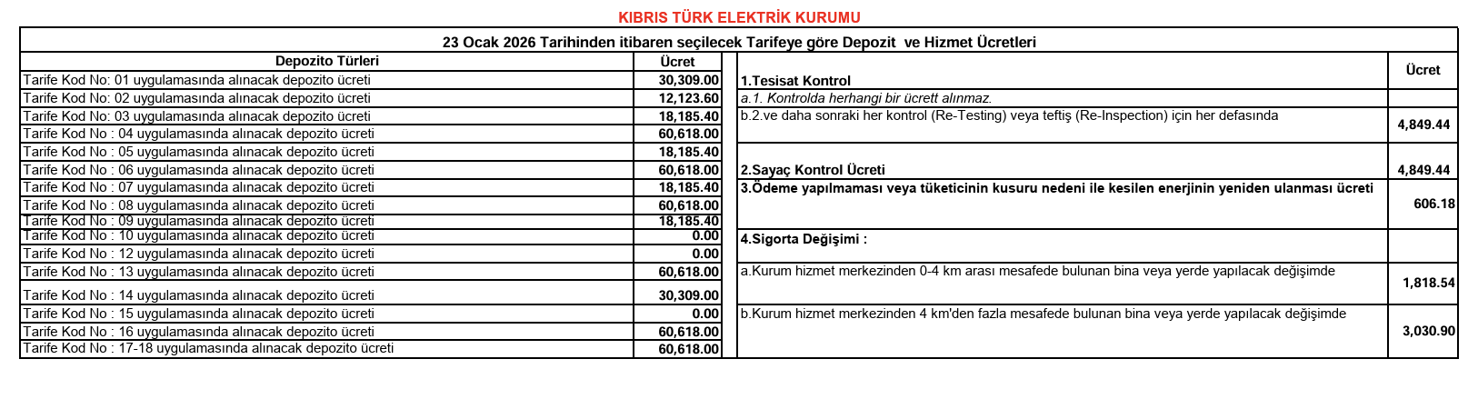 KIB-TEK’ten verilen bilgiye göre, yeni ücretler 23 Ocak’tan itibaren uygulanmaya başlandı.
