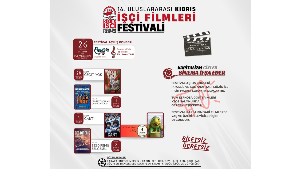 Festival kapsamında, 1 Nisan’da “Demiryolcular”, 4 Nisan’da “Cart”, 8 Nisan’da “BES Direniş Belgeseli” gösterilecek. Filmlerin tümü Kıbrıs Türk Öğretmenler Sendikası Salonu’nda saat 19.00’da başlayacak.