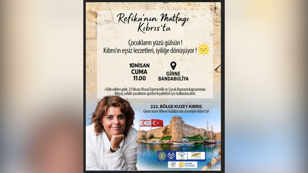 222. Bölge Kuzey Kıbrıs Girne Inner Wheel ve Refika’nın Mutfağı iş birliğiyle düzenlenen etkinlikten elde edilecek gelir, 23 Nisan Çocuk Bayramı kutlamalarında ihtiyaç sahibi çocukların gösteri kıyafetleri için kullanılacak.