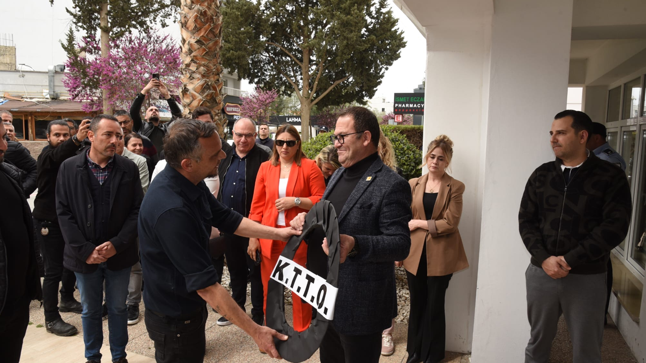KTTO önünde basın açıklaması yapan sendikalar, KTTO’ya siyah çelenk de bıraktı. Çelengi Oda Başkanı Turgay Deniz aldı.