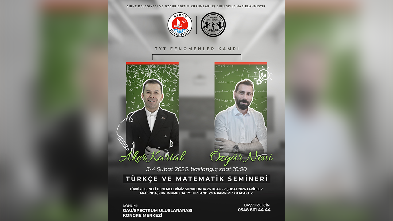 Girne Belediyesi ile Özgür Eğitim Kurumları iş birliğinde hazırlanan ‘TYT Fenomenler Kampı’, 3 - 4 Şubat 2026 tarihlerinde düzenlenecek. Saat 10:00’da başlayacak programda, Türkçe ve Matematik alanlarında seminer düzenlenecek.