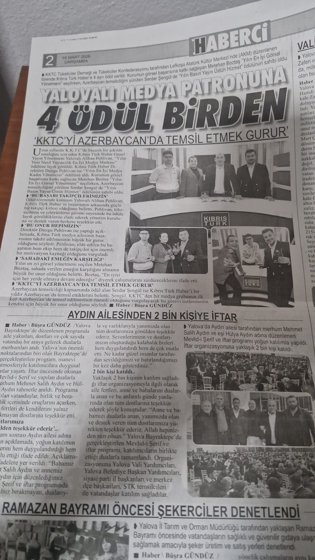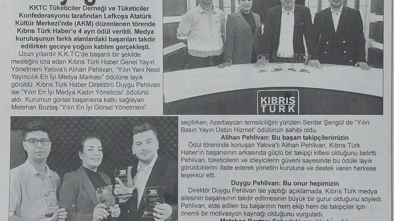 Kuzey Kıbrıs Türk Cumhuriyeti’nde düzenlenen ödül töreninde medya alanında elde edilen başarılar, Türkiye basınında da büyük ilgi gördü. Yalova merkezli yerel gazeteler, KKTC’deki bu önemli başarıyı manşetlerine taşıdı.